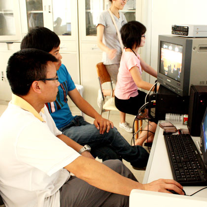 学生在影视后期制作室制作...