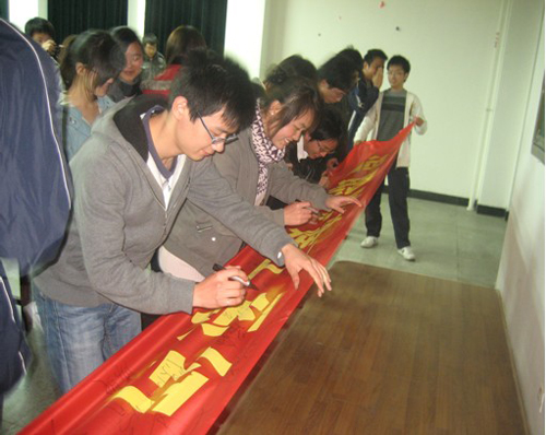 大会开始,王保卫同学首先向大家讲述了红色阵营的创建历程以及红色阵营的主要事迹,鼓励同学们积极向党组织靠拢,为这个先进优秀的集体注入新的活力。接着布置我们本学期的建设重点——创建学习型党组织,号召广大学生树立终身学习、自主学习、学会学习的理念。全体学生党员、积极分子在创建学习型党组织的红色条幅中进行了签名活动,以示决心。