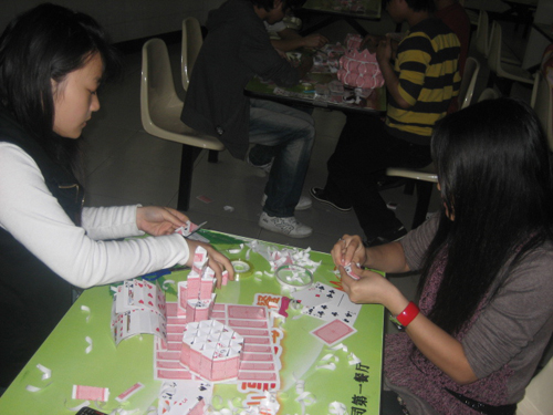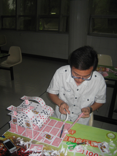 此次比赛现场将近有二十多组选手参赛。他们运用自己灵巧的双手,发挥自己的丰富想象力,利用扑克制作出了各种各样的手工制品。随后根据选手对自己作品的精彩的解说,并且测试自己制作的作品的承重力,评委根据要求对每组作品进行评选,评比出了最终获奖的作品。