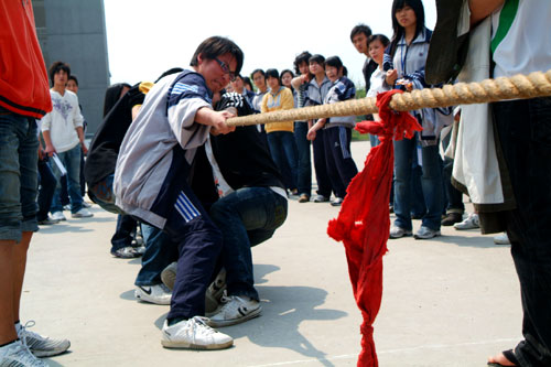 你看这边场地上人蛇钻洞的选手跌跌撞撞,动作笨拙依然锲而不舍,逗得观众笑个不停;场地中间的拔河比赛又激战正酣,队员们捋肘卷袖,扎起马步,个个面红耳赤,斗志高昂;最有趣的当属抬轿子比赛,被抬的人不能太重,抬的人重心要稳,而且步伐要整齐,节奏要一致,需要3个人的密切配合,然而“人仰马翻”的场景常常上演,令人捧腹。场上比赛紧张激烈而不乏乐趣,场下的观众虽未亲自上场,却也全神贯注,为选手鼓掌叫好。体育老师黄淼说:“在校园中,平时见多也玩惯篮球、足球、排球等竞技体育项目,现在大学生们玩这些传统民俗体育运动项目特别带劲。本次运动会也给予了每一名青年学生一次难得的机会来了解民间传统体育项目,也让学生在竞技体育外享受到了体育所带来的快乐。”一位大一女生说:“在校园里举办民俗体育运动会,这种形式很新颖,能让我们在紧张的学习状态中得到放松,在快乐中体会到大学生活的丰富多彩,第一次在校园看到了如此别开生面的体育盛会。”