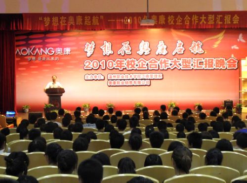9月17日晚,由工商系和奥康鞋业销售有限公司联合主办的“梦想在奥康启航”——2010年校企合作汇报晚会在信息报告厅隆重举行。奥康公司走进高校,宣讲企业文化,为2010级新生进行了一场生动的始业教育课,为新生职业生涯规划启航。