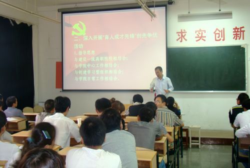 据悉,本次会议是在9月17日全系教职工“创先争优”动员大会的基础上召开的。会议提出了党组织的“创先争优”工作目标:创建一个“学习型、创新型、科学型、文化型、服务型、效能型、廉洁型”的富有活力的基层党组织,充分发挥党组织的创造力、凝聚力、战斗力。会上,黄书记说,按学院要求,“育人成才先锋”创先争优活动要与建设一流高职院校相结合,与学院中心工作相结合,与创建学习型组织相结合,与学院日常工作相结合。围绕“创先争优”的主要目标,黄书记通过课件给大家展示了以下五点工作措施:优化支部设置,扩大组织覆盖面;完善党建制度,促进基层党组织和谐发展;推进学习型党组织建设,为系部发展提供思想保证;开展志愿服务活动,提高服务水平;整合人力资源,创新组建项目团队。还强调了具体做法:对党总支委员的分工作了调整,对两个支部进行了优化设置,这样有利于扩大组织覆盖面和组织支部创新活动;建设学习型党组织,系理论中心组学习采用轮流辅导制,党员集中理论学习安排我系创先争优活动领导小组人员轮流辅导,每一位党员都要给学生做一次学习心得交流;建立健全党员导师制、教工党员“三联系”制度,使每一名教师党员联系1个学生班级、1个学生寝室和1名以上困难学生等等。并要求党支部和党员作出相应的公开承诺。
