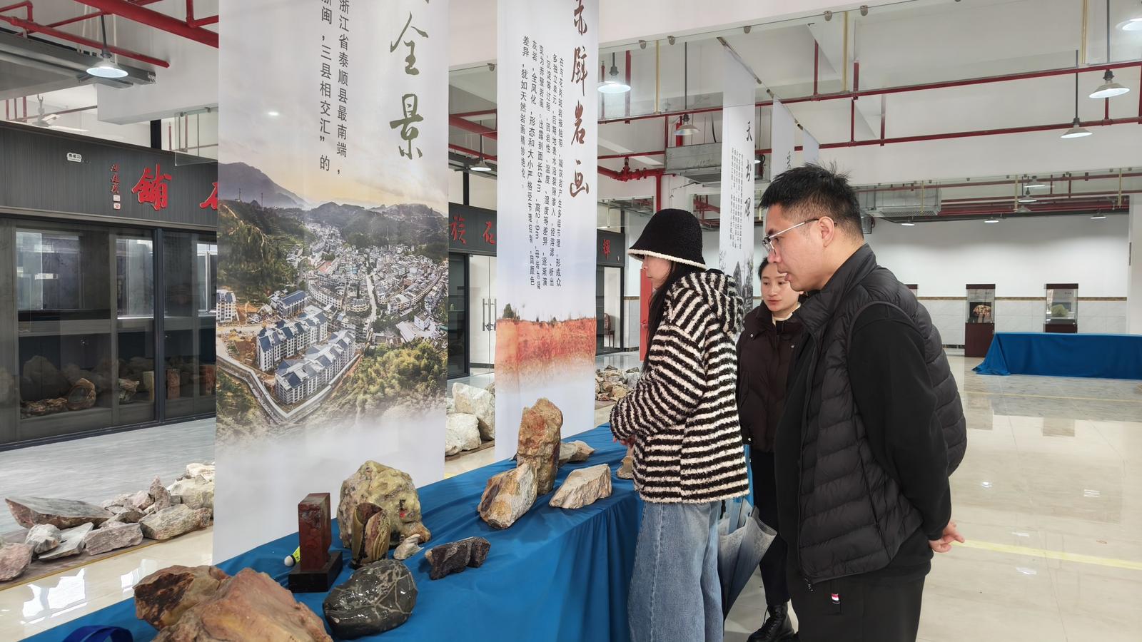 温州市科技特派员夏志良(右)在观察展示的泰顺石(曾庆华 摄)