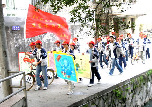 昨天,温州职业技术学院的学生在“世界水日”里以一路骑车一路宣传的方式,向群众宣传防洪抗旱、人水和谐等主要内容。图为宣传车队经过三垟湿地汀岙村。