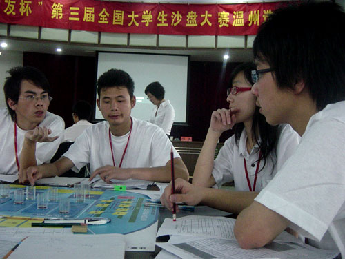 在桌子上模拟企业采购、生产、销售、物流、财务等各个经营环节的第三届全国大学生沙盘大赛温州选拔赛前天落下帷幕。本次选拔赛有温大城市学院、温州职业技术学院、浙江东方职业技术学院、浙江工贸职业技术学院等4所院校的8支队伍参赛。