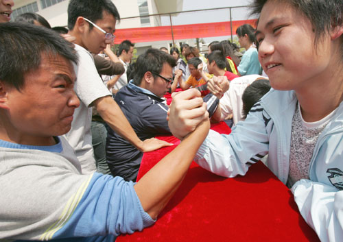 昨天中午,温州职业技术学院举办了一场别开生面的“腕力王”掰手腕比赛,经过一番角逐,参赛的40多名大学生中,有6名“大力士”夺得“腕力王”称号。据悉,举办这次活动的目的主要是丰富同学们的课余生活,倡导全民健身意识与活跃集体活动氛围。