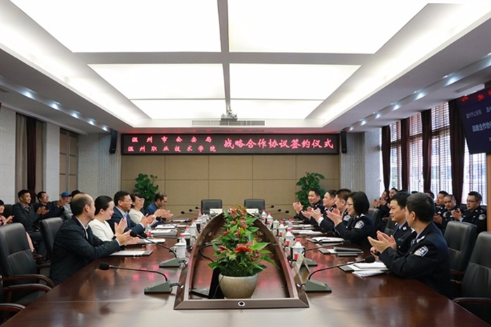 11月8日上午,我院与温州市公安局在学院技术研创大楼会议室隆重举行了温州市公安局与温州职业技术学院战略合作协议签约仪式。我院党委书记王靖高、温州市公安局副局长王造、我院副院长王志梅、市公安局网安支队队长郭筱敏等市网安支队领导、我院信息技术系主任田启明、副主任黄河及教科研人员参加了签约仪式。仪式由田启明主持。