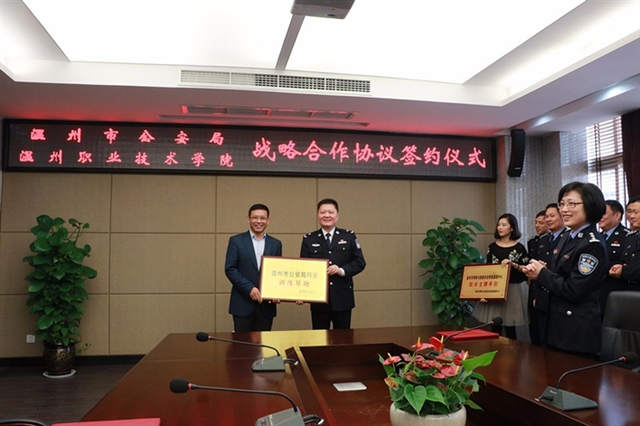 仪式上,我院与温州市公安局签订了战略合作协议,并授牌成为“温州市网络与信息安全信息通报中心技术支撑单位”和“温州市公安局网安训练基地”。
