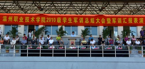 汇报表演前,党委副书记倪集崇教授在温州军分区领导的陪同下检阅了2010级新生组成的40多个军训连队。随后,新生们以饱满的精神状态、昂扬的斗志进行了分列式表演。他们队列整齐,步伐统一,英姿飒爽,意气风发,表现出新一代大学生良好的基本素养和精神风貌。之后,副院长兰玉景同志宣读了军训表彰决定,为军训先进集体、先进个人颁发了荣誉证书。